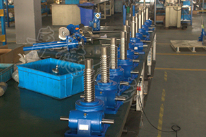 蝸輪絲杆升降(jiàng)機結構簡單,驅動源驅動蝸杆蝸輪,蝸輪中心內螺紋(wén)帶動絲杠升降。結構型式根(gēn)據現場安裝(zhuāng)需要可選螺(luó)杆做軸向運動或螺母(mǔ)做軸向運動,螺杆做軸向運動(dòng)即蝸輪和螺杆通(tōng)過螺紋連接,螺杆(gǎn)做軸向運動完成升降;螺母做軸向運(yùn)動即蝸輪(lún)與螺(luó)杆通過(guò)鍵聯接,螺杆上配螺母,螺(luó)杆上的螺母做軸向運動。絲杆升降機兩種結構型式又可分為兩種裝配型式(shì)即螺杆工作端在上(螺母上頂或下拉);螺杆工作(zuò)端在(zài)下(螺(luó)母下壓或上拉(lā))。