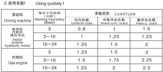 式中P1N為選型功率,P1為實際(jì)需要的功率,f為使用係數,PN為許用功率。