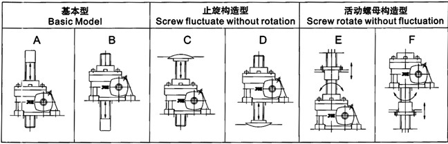 1、基本(běn)形式:螺母(蝸輪)轉動絲杆(gǎn)上下移動,此為普通型升降(jiàng)機安裝方式。