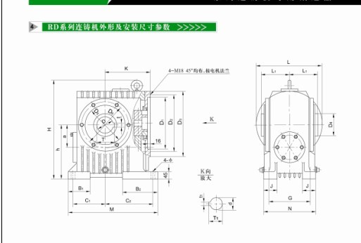 RD係列減速機是冶金行業雜軋鋼機組中拉矯機,引錠杆存放裝置及振動裝置專(zhuān)用的二次包絡蝸杆減速機。引進美國羅可普公司(sī)(ROKOPCO/U.S.A)_技術生產,采用軸裝是結構(gòu),易於同工作機械相聯,箱體采用樹脂砂鑄造,結構緊湊,外形美觀,傳動比(bǐ)可隨用(yòng)戶要求而變。