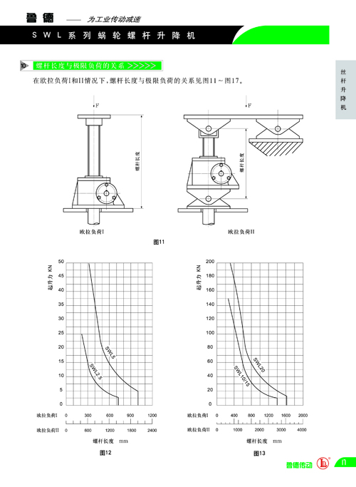 上圖給出了允許彎曲力矩下,螺(luó)杆的長度與_負荷的關係。根據螺杆的行程和起升(shēng)負荷,查出所需升降機的型號,再根據查出的升降機型(xíng)號(hào)和起升(shēng)負荷查出(chū)蝸輪絲杆升降機的在不同起升負荷下(xià)允許(xǔ)的起(qǐ)升速度,若查出的起升速(sù)度(dù)滿足不了要求,則須選用型號大一規格的升降機,直至滿足要求。