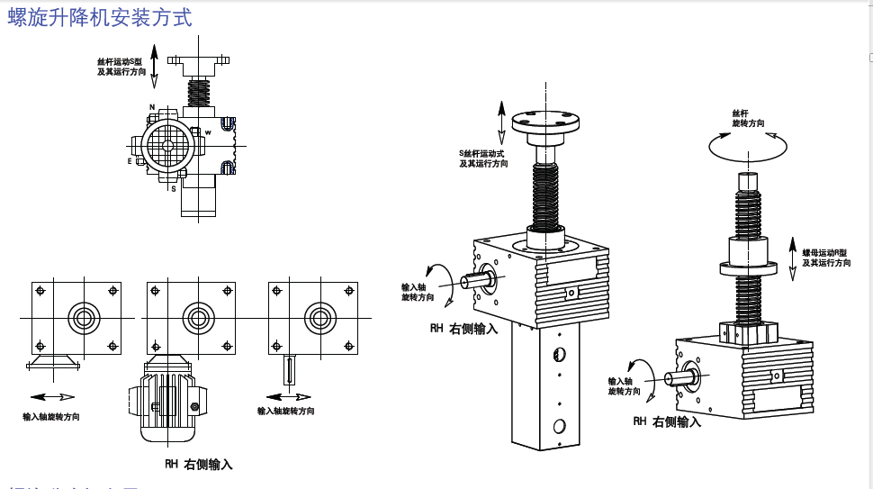 S型(xíng)螺旋升降機(jī)的(de)原理為蝸杆驅動蝸輪旋(xuán)轉,蝸輪中間為(wéi)內螺紋孔機(jī)構(與絲杠相齧合),再將旋轉運動傳遞至絲杠上下直線運動。