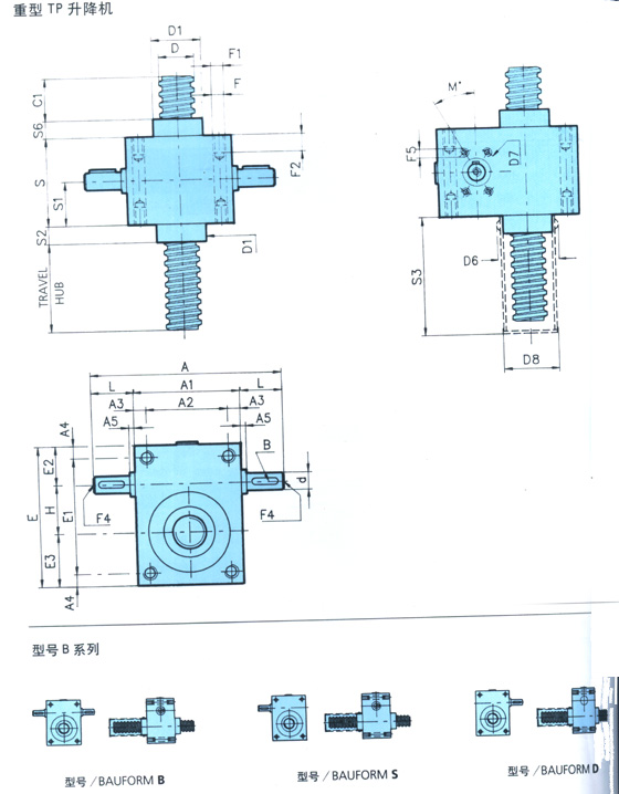 TP係列升降(jiàng)機,TP升降機:TP機械絲杠升降機操作簡單,可靠性強,低維修率等優點, 使螺旋千斤頂有著廣闊的應用範圍.TP機械千斤頂配有自 動連鎖機構,即他們能支撐自身重量而不(bú)必采用閘或其它 鎖定係統(tǒng).千斤頂可單獨使用(yòng)也可與軸、聯軸節,傘(sǎn)齒輪傳動器結合共同使用。他們可由交(jiāo)流或直流電機驅動,也可由(yóu)液壓或氣壓電機驅動,他(tā)們可手動驅動也可用其它傳動形式;