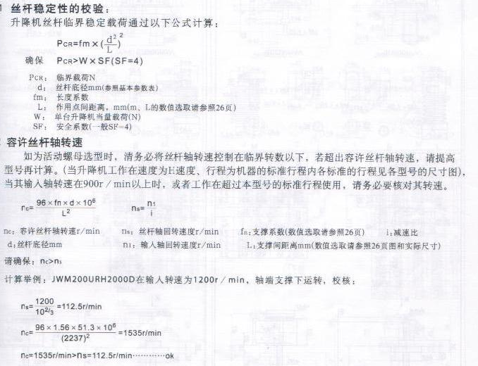 絲杆升降機在提升不同的負(fù)荷時(shí),所允許的扭矩、功率、轉速也不同,且(qiě)不(bú)同工作持續率(lǜ)的_功(gōng)率也不同,當壓力負荷減小時,提升高度可隨(suí)之增大。選擇升降機是無論(lùn)是(shì)靜載、動(dòng)載、衝擊載都不能_過(guò)其允許承受的_載荷,要根(gēn)據安全係數、使用行程、校對絲(sī)杆的穩定性選擇具(jù)有(yǒu)充分容量的(de)升降機(jī)。