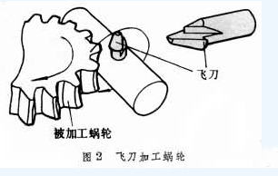 飛刀相當於蝸輪滾刀的一個刀齒。飛刀切(qiē)齒隻(zhī)能采用切向進給法,在滾齒機上可(kě)使飛刀轉(zhuǎn)一周蝸輪轉Z1個齒(chǐ),再加上飛刀的切向進(jìn)給與工作台的附加(jiā)轉動,也能按展成法原理切出正確的(de)齒形(xíng)。