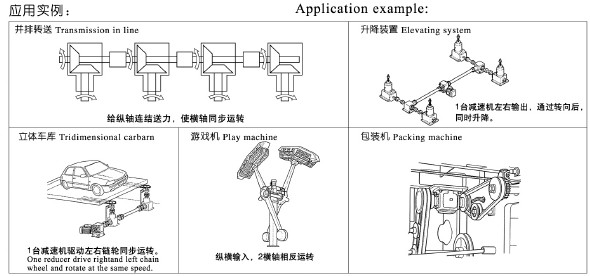 轉向器可做並排傳送(sòng);立體車庫(一台(tái)減速機驅(qū)動左(zuǒ)右鏈輪同步運轉),升降平台,包裝(zhuāng)機,遊戲機應用等。T型轉向箱具(jù)有多種安裝形式,選用方便(biàn)。