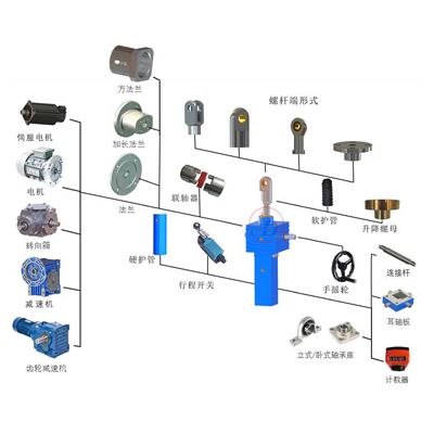 可以直接與電機(jī)、減速電機、特殊功能(néng)附件的任意組合,一體化設計,為客戶提供上千種的選擇。可以按照客戶要求非標設計(jì),可裝配防塵罩,反(fǎn)齒隙設計,安全螺母,滾珠絲杠(gàng),限位開關,過載離合器,電位計,編碼器,製動器,手搖把,安裝附(fù)件(jiàn)等。